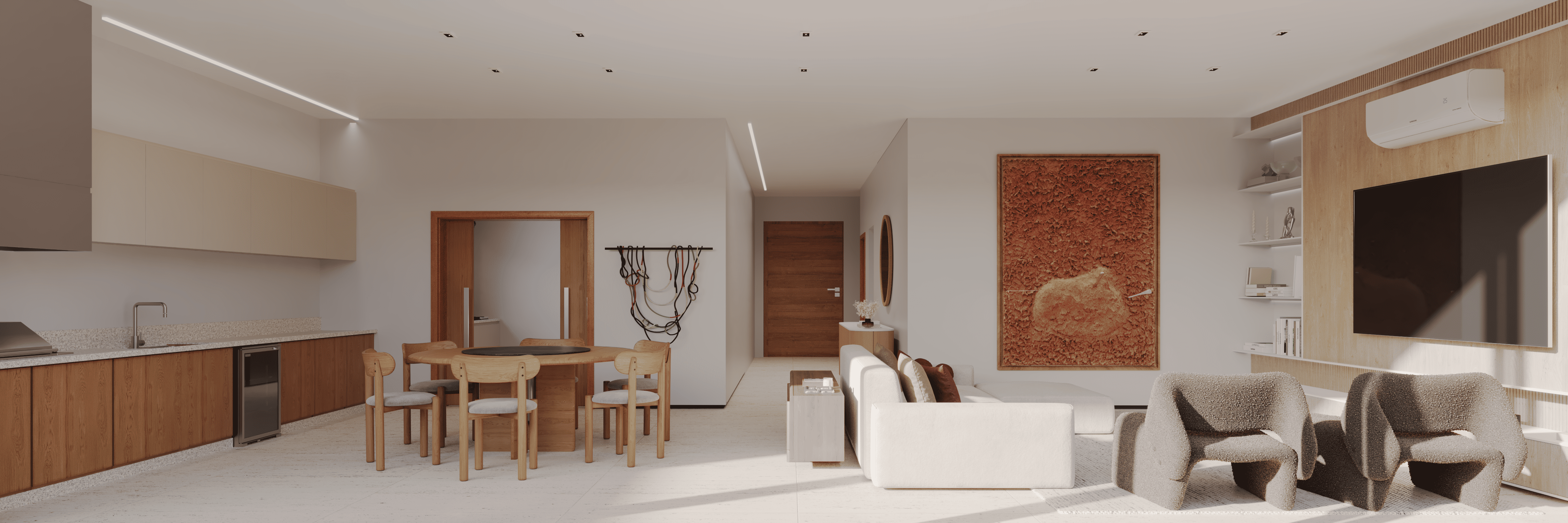 A cozinha é separada da varanda gourmet, que, por sua vez, possui uma ampla abertura voltada para a área da piscina, criando um espaço perfeito para receber e viver com conforto.